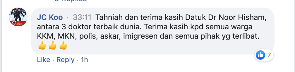 Menurutnya, ia merupakan pengiktirafan bagi negara dan beliau memanjatkan ucapan terima kasih kepada semua yang terlibat termasuk menteri-menteri, Perdana Menteri dan petugas barisan hadapan.