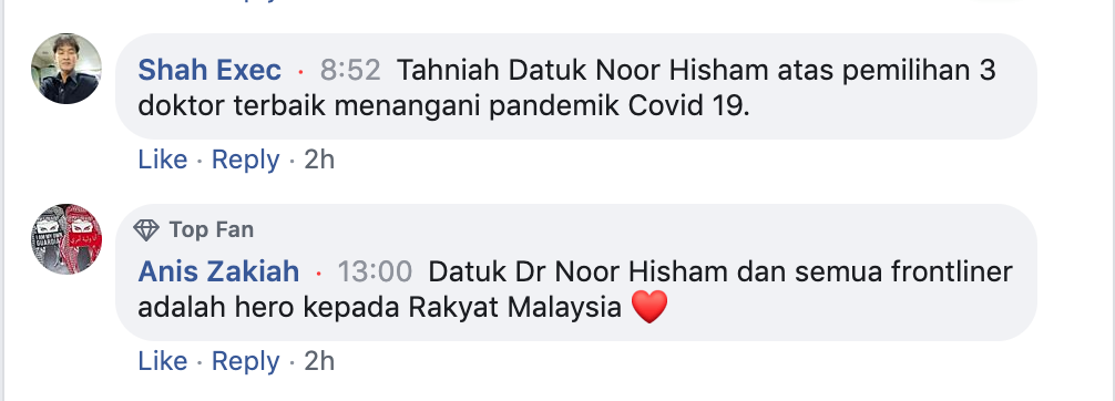 Sesuai dengan kecekapan beliau dalam menangani pandemik Covid-19 di Malaysia, Ketua Pengarah Kesihatan, Dr Noor Hisham Abdullah telah diiktiraf oleh rangkaian televisyen China Global TV Network (CGTN) sebagai antara tiga doktor terbaik di dunia dalam menangani wabak Covid-19.