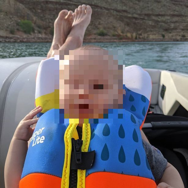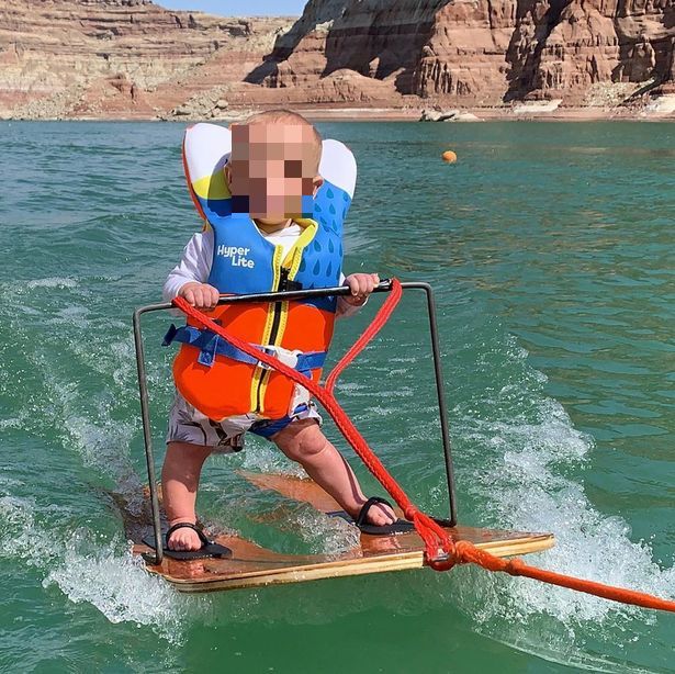 Gambar yang comel itu menunjukkan bayi tersebut lengkap dengan jaket keselamatan sedang meluncur air di Tasik Powell, Utah di atas papan peluncur sambil ditarik oleh bot di hadapannya.