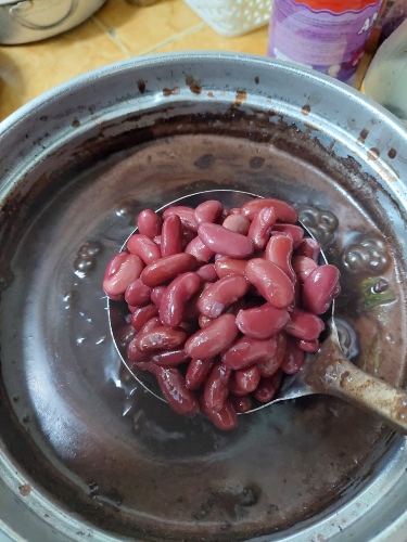 Sementara menunggu beras pulut hitam empuk, rebus kacang merah berasingan. Setelah kacang merah empuk, tos dan asingkan di sebelah.