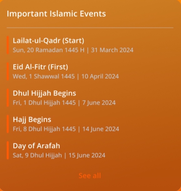 Paparannya mirip senarai peringatan (reminder), memudahkan pengguna merancang ibadah atau aktiviti berdasarkan tarikh-tarikh tersebut.