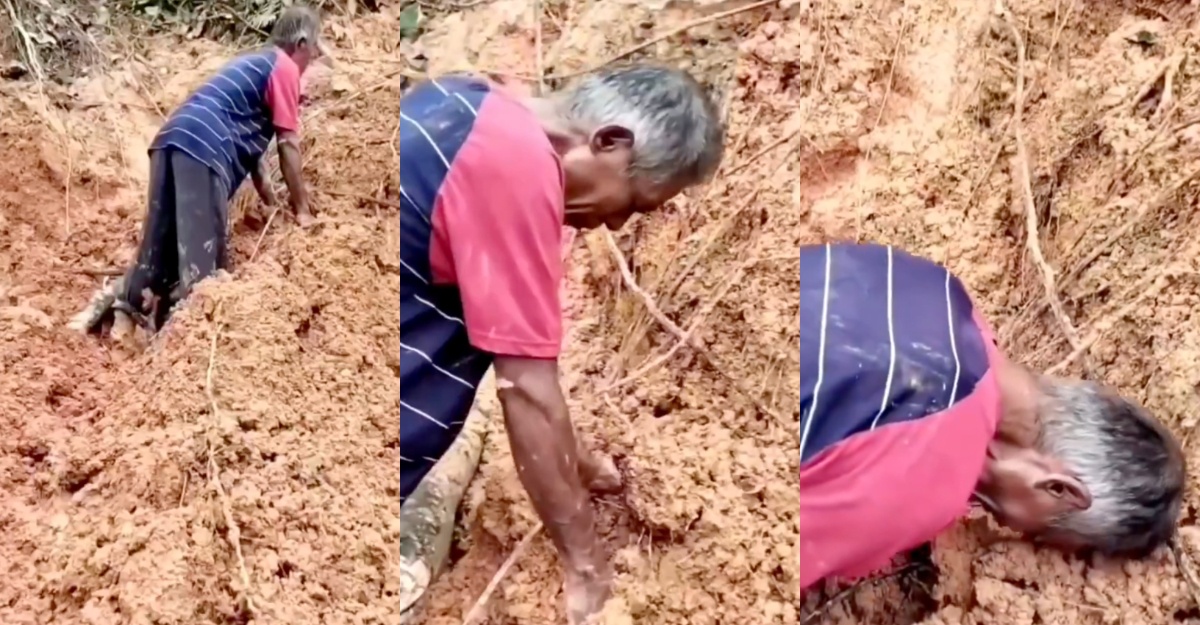 Dalam rakaman tersebut, lelaki yang kelihatan lusuh, diselimuti lumpur itu duduk lemah di tengah-tengah timbunan tanah runtuh.