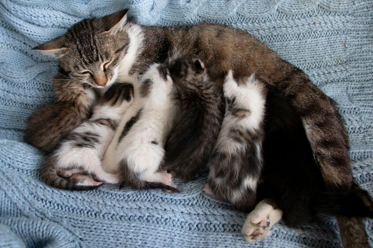 Rata-rata, kucing memerlukan waktu setengah hari bagi seekor ibu kucing untuk melahirkan semua anaknya. Anak kucing pertama akan lahir dalam waktu satu jam sejak awal persalinan aktif. Di sela-sela kelahiran anak kucing, induk kucing akan beristirehat dan harus diizinkan untuk mengasuh dan membersihkan anak kucing yang dilahirkan. Jika anda telah memelihara anak kucing di kotak lain, pindahkan kembali bersama induk kucing dan bantu mereka menemukan puting.