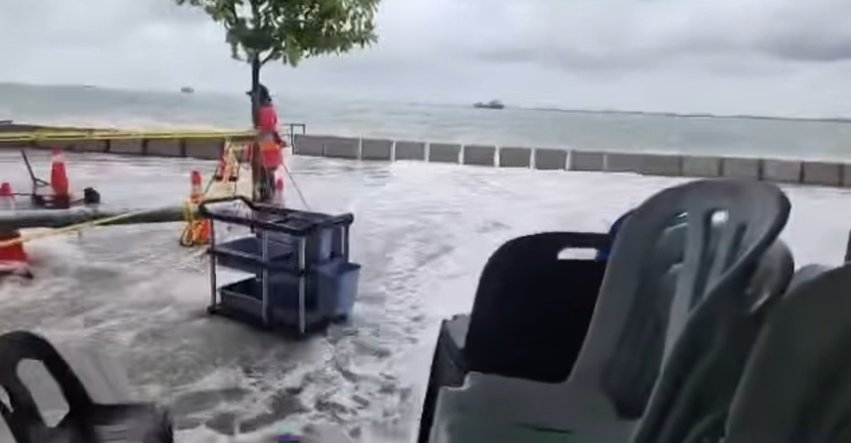 Air laut dilihat naik melimpah sehingga melepasi kawasan tempat duduk pengunjung di tepi pantai.