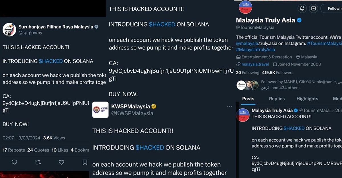 THIS IS HACKED ACCOUNT! INTRODUCING $HACKED ON SOLANA on each account we hack we publish the token address so we pump it and make profits together,” tulis hantaran pada setiap akaun yang digodam.