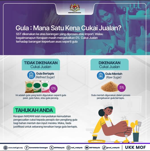 Menurut MOF, di bawah semakan semula SST yang akan berkuat kuasa mulai 1 Julai 2025, gula bertapis kekal tidak dikenakan cukai.