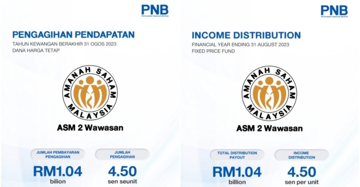 KUALA LUMPUR, 31 Ogos (Bernama) — Syarikat pengurusan unit amanah milik penuh Permodalan Nasional Bhd (PNB), Amanah Saham Nasional Bhd (ASNB), mengisytiharkan pembayaran pengagihan pendapatan berjumlah RM1.04 bilion yang akan memanfaatkan 914,008 pemegang unit.