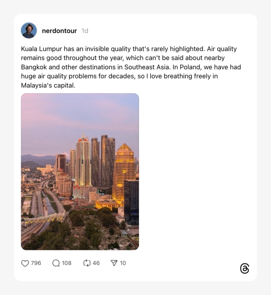 "Di Poland, kami mempunyai masalah kualiti udara yang sangat teruk selama berdekad. Saya suka sangat bernafas dengan bebas di ibu kota Malaysia," puji seorang warga asing.