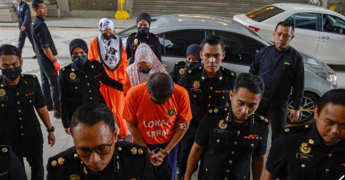 Kredit: BernamaMereka tiba di pekarangan kompleks mahkamah berkenaan menaiki sebuah van dan kereta milik Suruhanjaya Pencegahan Rasuah Malaysia (SPRM) pada 10 pagi.