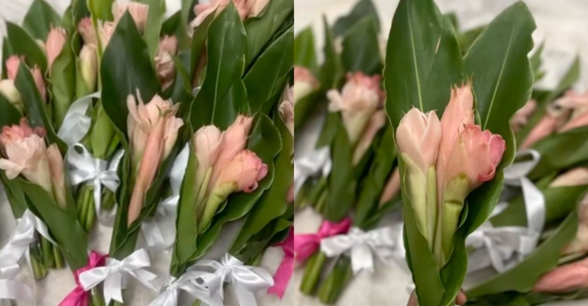 Menerusi rakaman yang dimuat naik di TikTok, wanita berkenaan menunjukkan hasil gubahan bunga kantan yang kelihatan kemas dibalut dengan daunnya. Beberapa tangkai bunga kantan dibalut kemas dengan dihiasi riben berwarna putih dan merah jambu. Tidak hanya kelihatan segar, setiap jambangan juga nampak menarik dengan warna asli bunga kantan yang pelbagai rona.