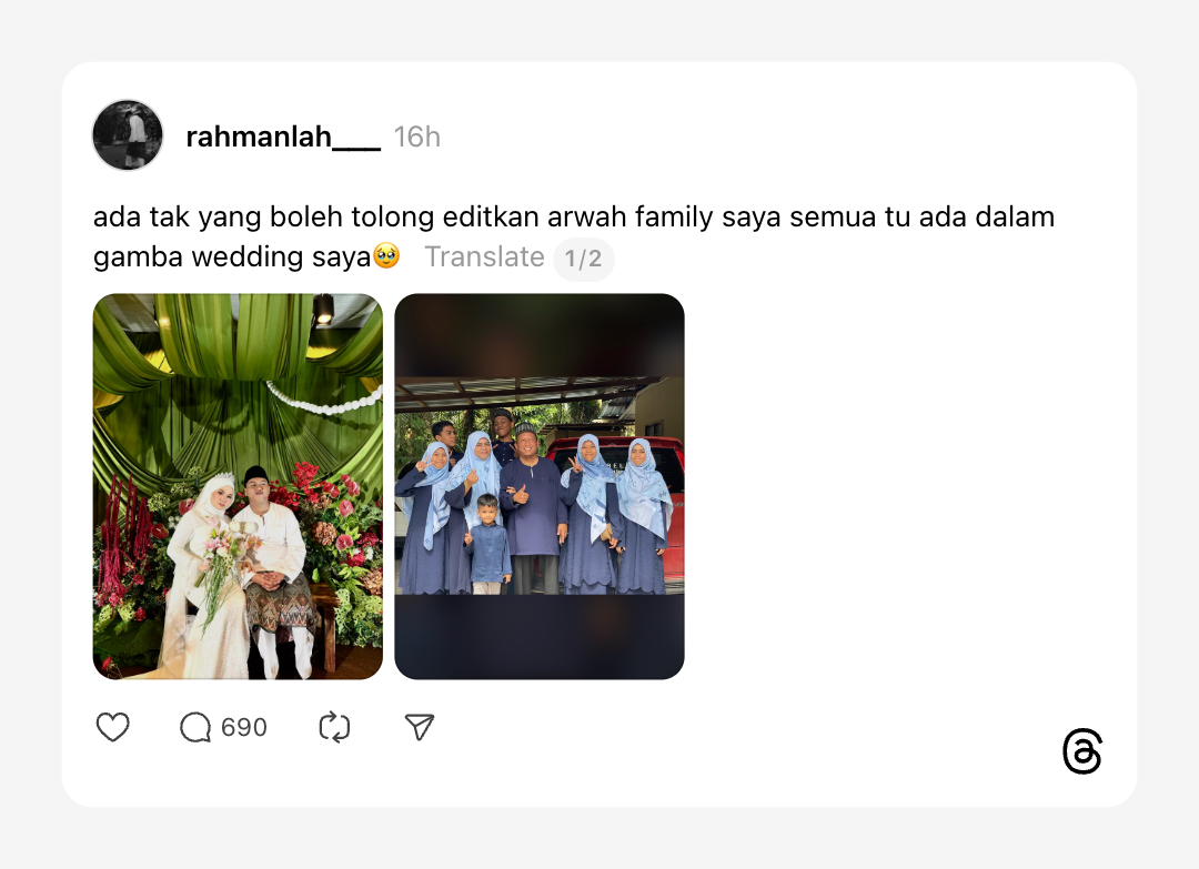 "Ada sesiapa boleh tolong edit gambar wedding saya supaya arwah ahli keluarga saya semua ada di dalamnya?" kata @rahmanlah___.