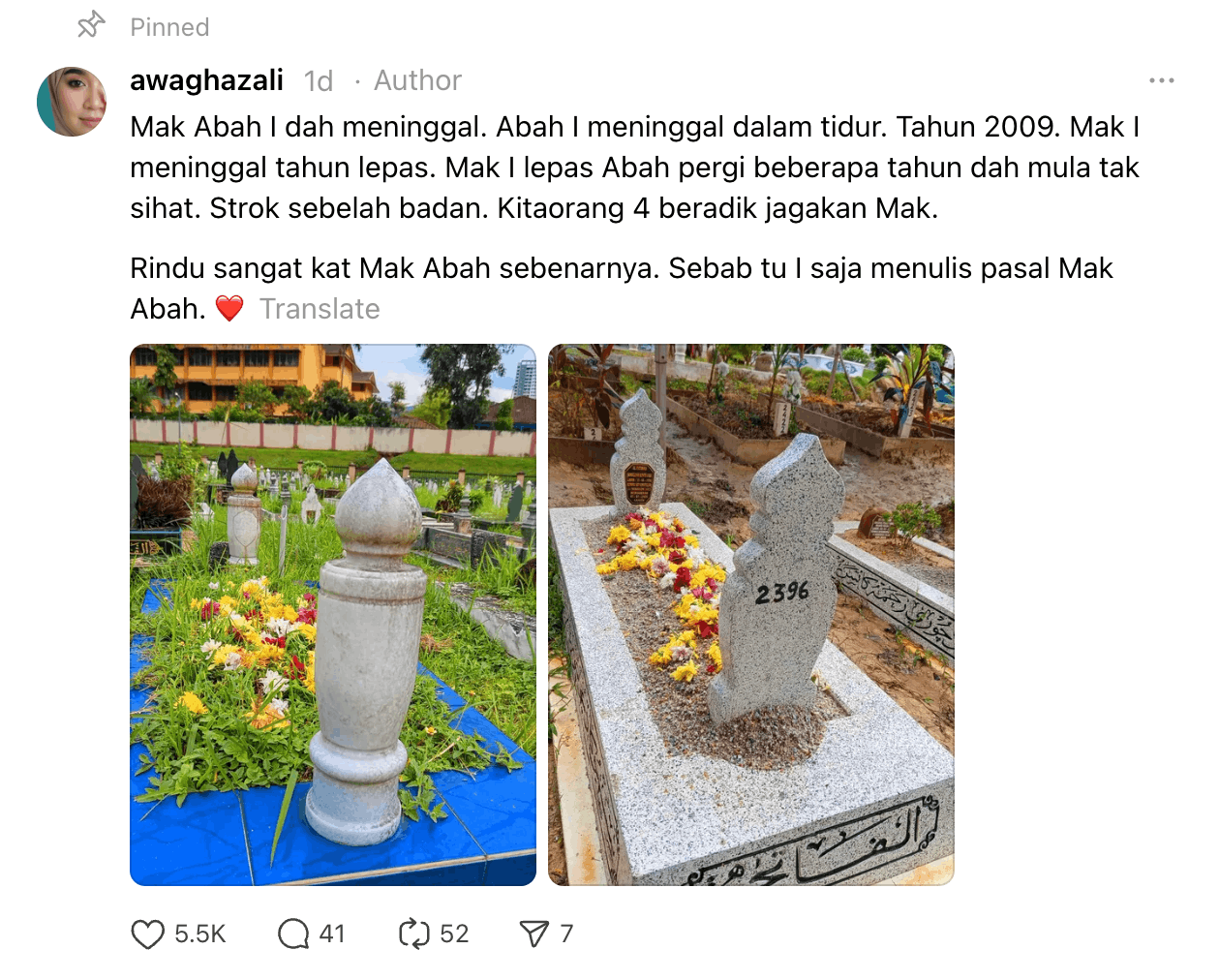 Dalam hantaran berasingan, wanita ini berkongsi kedua-dua ibu bapanya kini telah pergi. Ayahnya meninggal dunia dalam tidur pada tahun 2009, ibunya pula menyusul tahun lalu selepas mengalami strok.