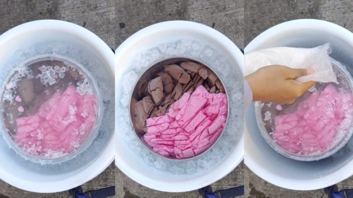 Dalam video @abamaiskriem, dia mengisi ketulan ais sehingga separuh daripada bekas aiskrim