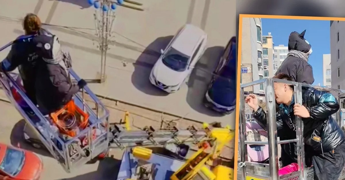Dalam video tular yang dimuat naik oleh Wang menerusi Douyin, seorang pekerja kren dilihat mengiringi seorang wanita muda menaiki pelantar. Kren itu kemudiannya mengangkat mereka ke balkoni rumah.