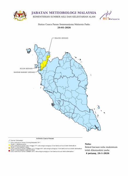 Tiga kawasan di Semenanjung Malaysia kini berada pada Tahap 1 (Berjaga-jaga) susulan cuaca panas.