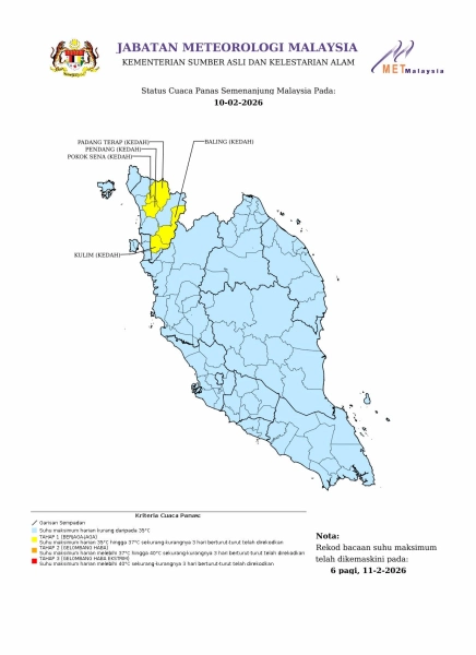 Jabatan Meteorologi Malaysia (MetMalaysia) memaklumkan terdapat lima kawasan di Semenanjung berada pada Tahap 1 (berjaga-jaga) susulan cuaca panas.