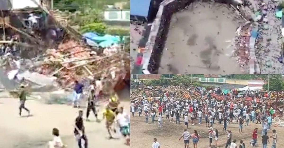 Dalam kejadian yang berlaku di pusat bandar El Espinal itu, pentas tiga tingkat yang diperbuat daripada kayu dilihat dipenuhi dengan penonton sebelum runtuh dan menghempas ke tanah.