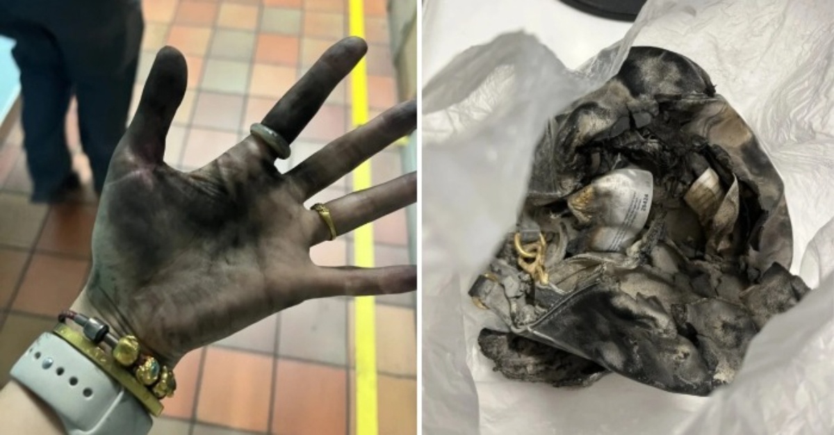 Beliau turut memuat naik gambar keadaan gerabak yang dipenuhi asap, tangannya yang menghitam, serta powerbank dan beg yang rosak akibat kebakaran.