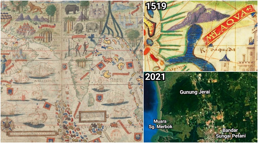 Peta ini telah diterbitkan pada tahun 1519 iaitu kira-kira 502 tahun yang lalu. Jika diperhatikan pada peta yang telah telah difokuskan, terdapat sebuah gunung dan juga dua cabang sungai yang mengalir ke Selat Melaka.