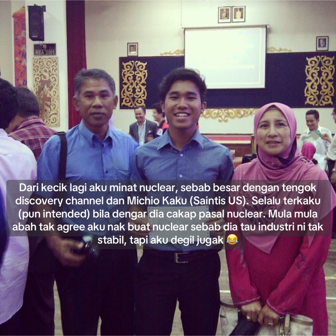 “Minat bermula sejak kecil. Saya bertuah sebab banyak luang masa tengok discovery channel atau Nat Geo (National Geographic) dan selalu tengok saintis terangkan tentang tenaga nuklear.