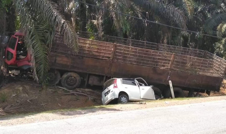 “Kemalangan melibatkan tiga buah kenderaan iaitu kereta mangsa dan dua buah lori termasuk sebuah treler tanpa muatan.