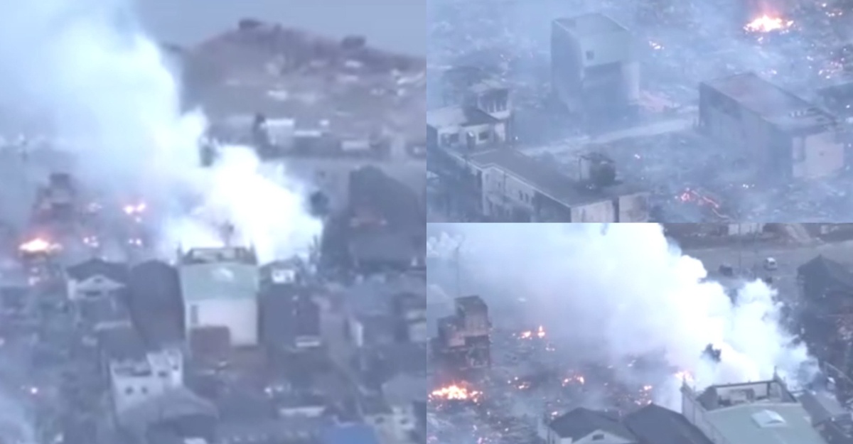 Dalam satu rakaman yang diambil oleh helikopter NHK sekitar jam 6:50 pagi menunjukkan, api jelas kelihatan di pelbagai lokasi dan asap putih bebas memenuhi ruang udara.