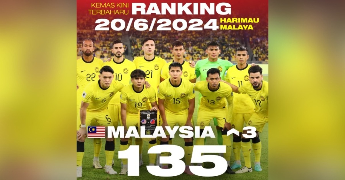 “Kemas kini terbaharu ranking FIFA hari ini, Malaysia di tangga 135 dunia, berjaya melonjak naik 3 anak tangga berbanding 138 pada kemas kini terdahulu, 4 April 2024,” kata FAM.