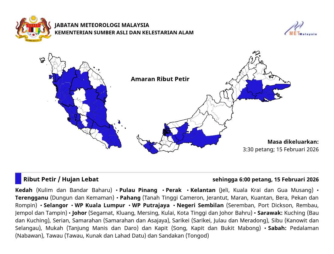 Jabatan Meteorologi Malaysia (MetMalaysia) mengeluarkan amaran ribut petir, hujan lebat dan angin kencang melibatkan 11 negeri dan dua Wilayah Persekutuan (WP) sehingga jam 6 petang ini.