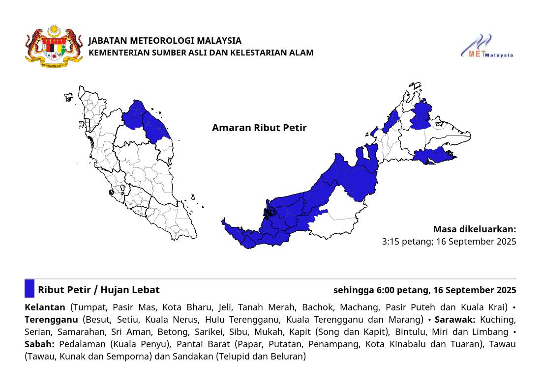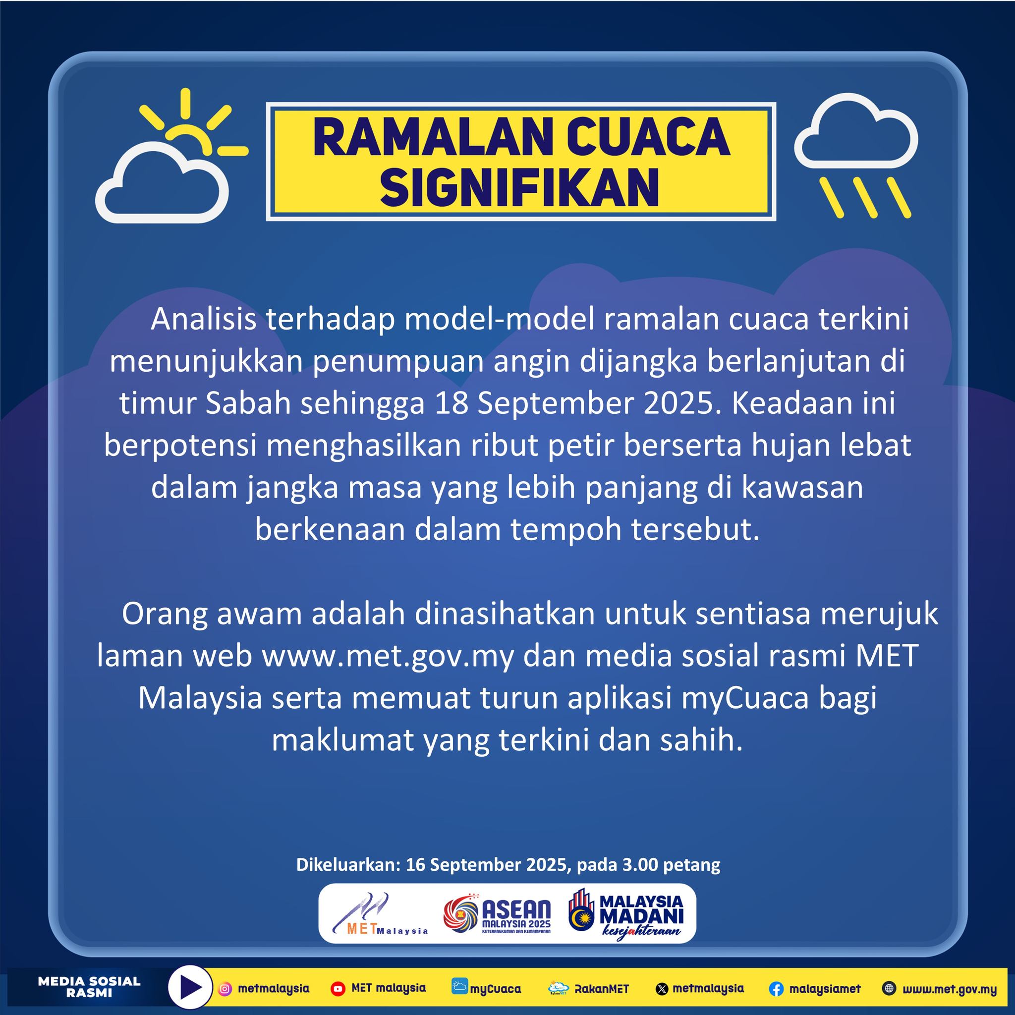 Dalam hantaran yang berlainan, METMalaysia memaklumkan analisis terhadap model-model ramalan cuaca terkini menunjukkan penumpuan angin dijangka berlanjutan di timur Sabah sehingga 18 September 2025.