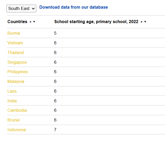 Sementara itu, Vietnam, Thailand, Singapura, Filipina, Malaysia, Laos, Kemboja, Brunei dan Timor Leste masing-masing pula bersekolah pada umur 6 tahun.