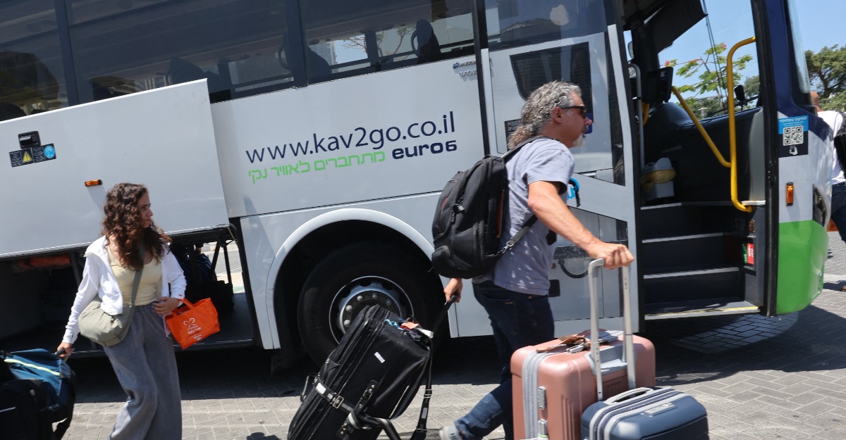 Beberapa penumpang yang membawa bagasi dilihat turun dari bas di terminal, selepas Pihak Berkuasa Lapangan Terbang Israel menasihatkan orang ramai agar tidak memesan teksi atau datang menjemput penumpang yang tiba di Lapangan Terbang Ben Gurion kerana “situasi keselamatan semasa”.