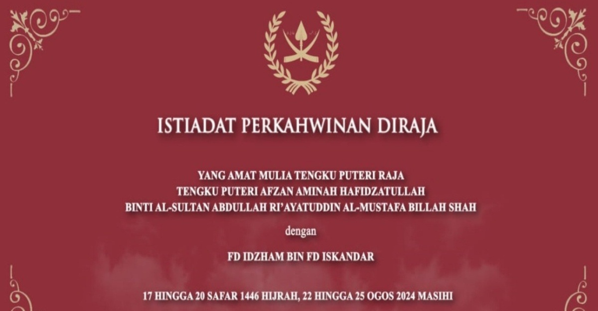 KUANTAN, 21 Ogos (Bernama) — Istiadat perkahwinan puteri Sultan Pahang Tengku Puteri Raja Tengku Puteri Afzan Aminah Hafidzatullah dengan pasangannya FD Idzham FD Iskandar bakal bermula di Istana Abdulaziz esok.