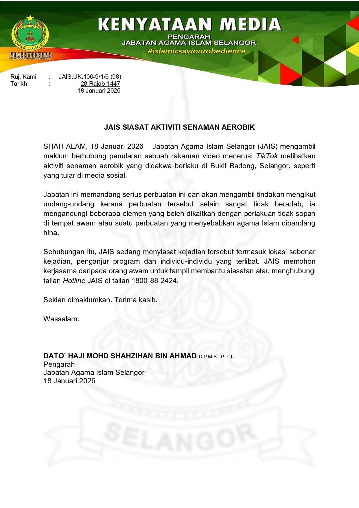 Jabatan Agama Islam Selangor (JAIS) mengambil maklum penularan sebuah rakaman video di aplikasi TikTok yang memaparkan aktiviti senaman aerobik yang didakwa berlaku di kawasan Bukit Badong, Selangor, seperti yang tular di media sosial sejak kebelakangan ini.