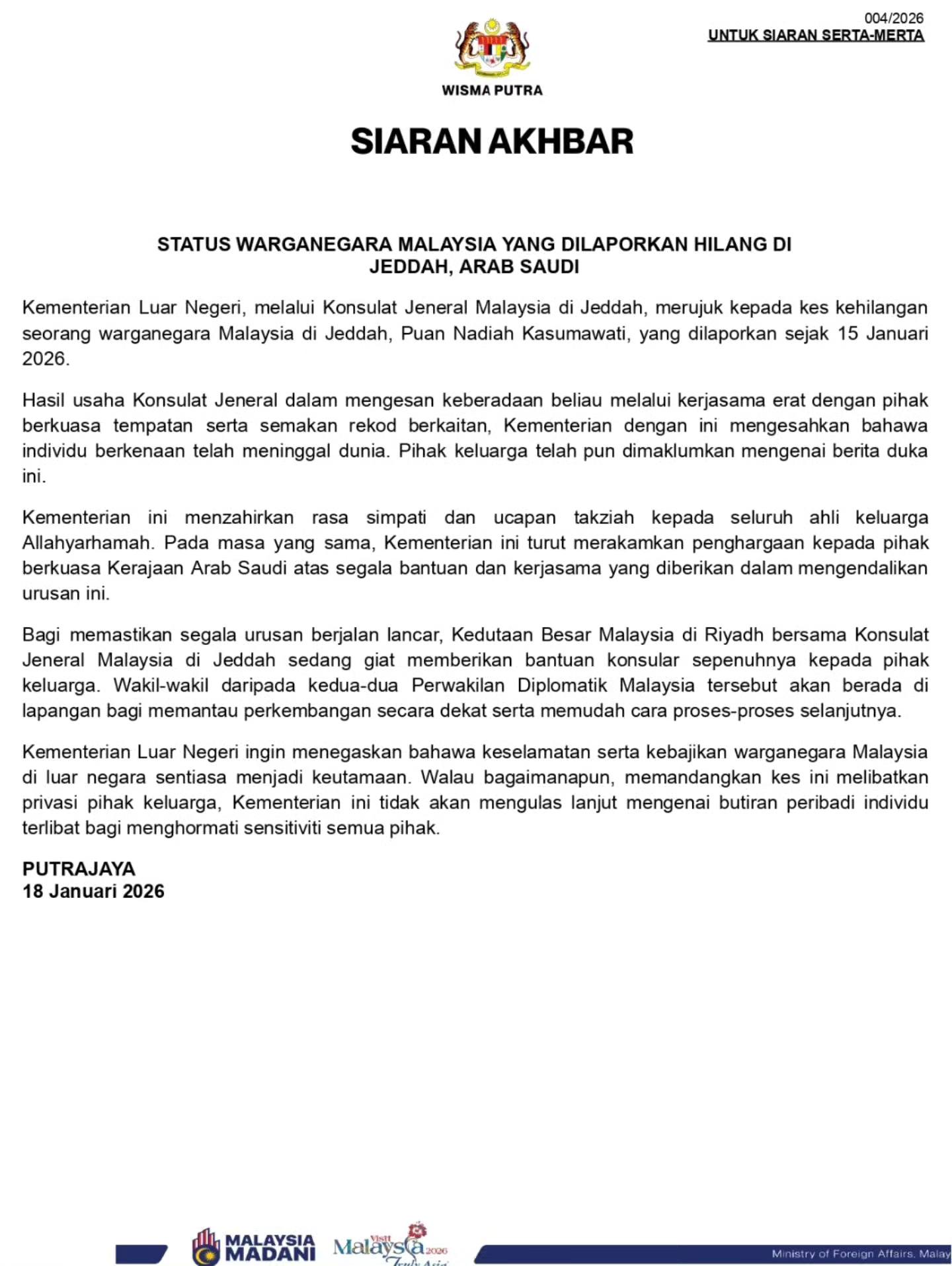“Kementerian Luar Negeri ingin menegaskan bahawa keselamatan serta kebajikan warganegara Malaysia di luar negara sentiasa menjadi keutamaan