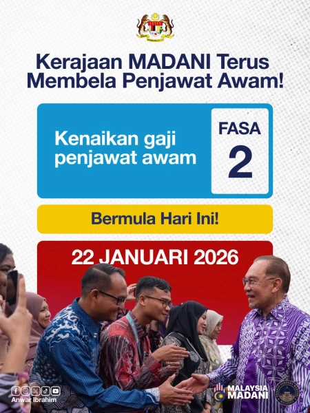 Untuk pengetahuan, pelarasan gaji fasa kedua merupakan kesinambungan kenaikan gaji di bawah SSPA yang diumumkan pada 2024, melibatkan kadar keseluruhan 15 peratus bagi Kumpulan Pelaksana, dan Kumpulan Pengurusan dan Professional serta tujuh peratus bagi Kumpulan Pengurusan Tertinggi (KPT).