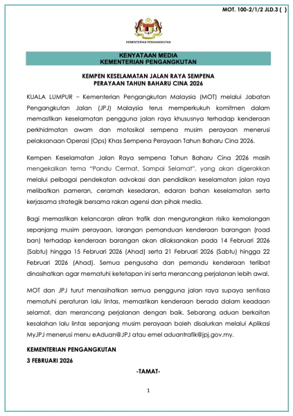 Menerusi kenyataan Kementerian Pengangkutan Malaysia (MOT), JPJ memperkukuh keselamatan pengguna jalan raya, khususnya kenderaan perkhidmatan awam dan motosikal sempena Operasi Khas Tahun Baharu Cina 2026.