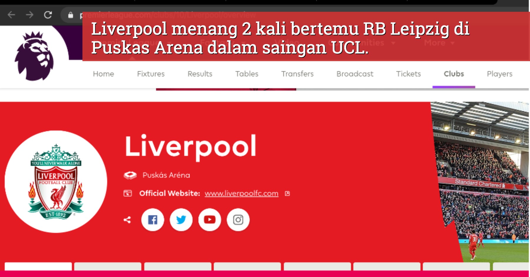 Lucunya, semakan di laman web Premier League, nama “Home Stadium” Liverpool yang sepatutnya ditulis Anfield kini bertukar kepada Puskas Arena?