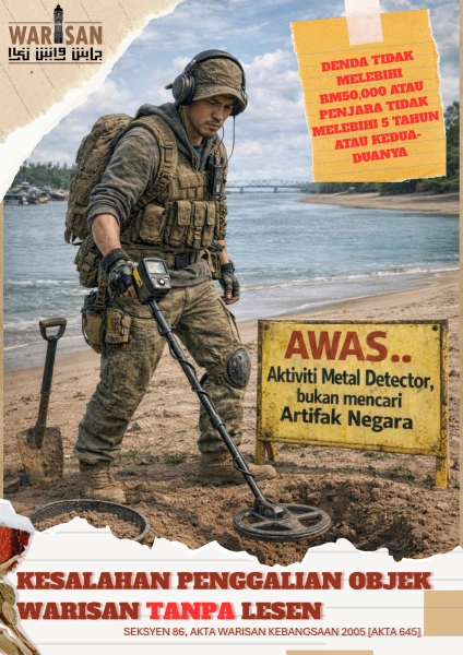 Justeru, orang ramai diingatkan agar tidak terlibat dalam sebarang aktiviti penggalian tanpa lesen, serta melaporkan kepada pihak berkuasa jika mengetahui sebarang aktiviti mencurigakan berkaitan penggalian objek warisan.