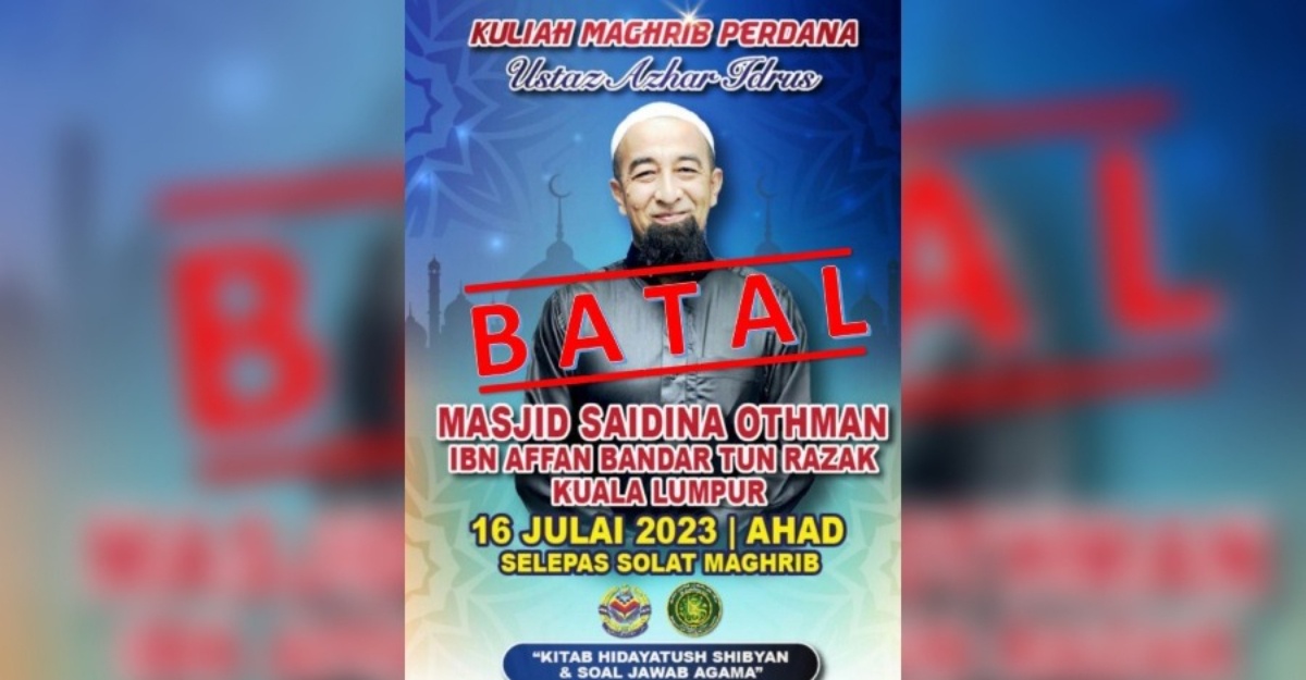 “Dukacita dimaklumkan bahawa Kuliah Maghrib Perdana UAI yang akan diadakan di Masjid Saidina Othman, Bandar Tun Razak pada 16 Julai 2023 terpaksa dibatalkan atas arahan pihak tertentu.