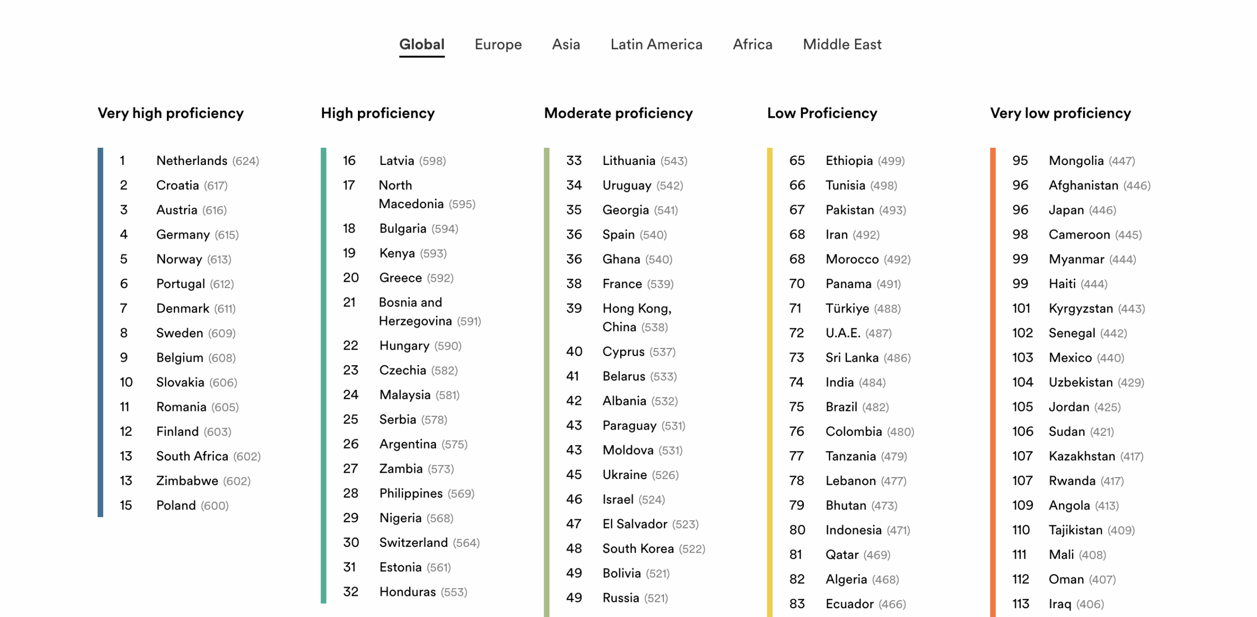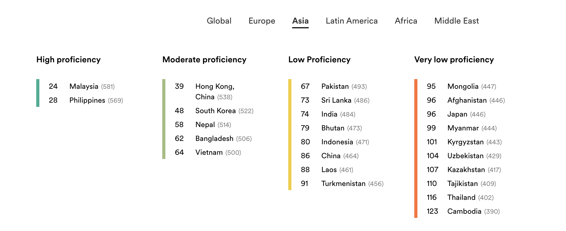 Mengisi 10 terbaik Asia adalah Hong Kong (538), Korea Selatan (522), Nepal (514), Vietnam (500), Bangladesh (506), Pakistan (493), Sri Lanka (486), India (484), Bhutan (473) dan Indonesia (471).