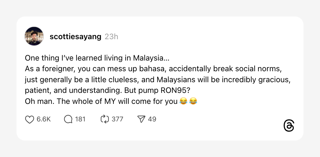 “Orang Malaysia terkenal dengan mengikut peraturan, walaupun kadang-kadang kami ni keras kepala. Biasanya kami boleh bertolak ansur dan selalu beratur dalam barisan, jadi ya, ambil RON95 kami memang satu jenayah besar dan kami bersatu untuk korek sampai ke lubang cacing,” jelas seorang lagi.