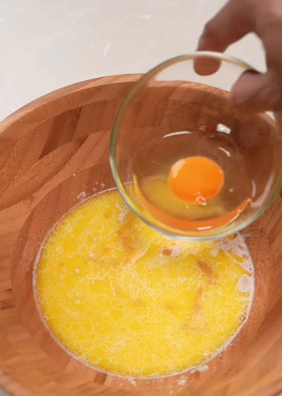 Tambahkan pula satu sudu kecil esen vanila dan satu biji telur. Akhir sekali, masukkan setengah sudu kecil garam dan kacau semua bahan sehingga sebati.