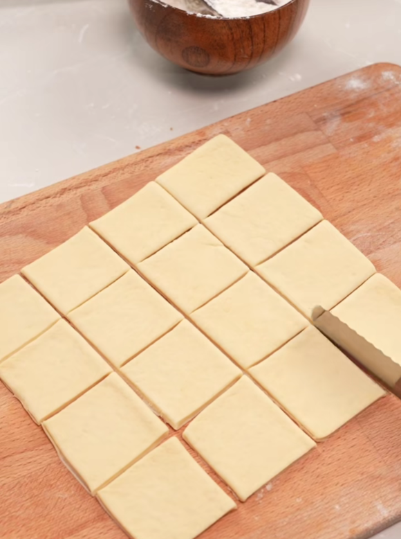 Lenyekkan doh sehingga nipis, kemudian potong menjadi petak kecil bersaiz kira-kira 4x4 cm.