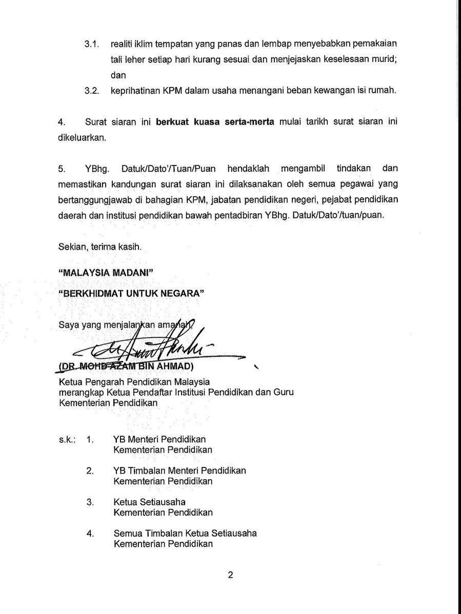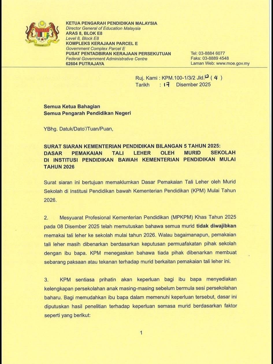 Kementerian Pendidikan Malaysia (KPM) memutuskan bahawa pemakaian tali leher oleh murid sekolah di bawah institusi pendidikan KPM tidak lagi diwajibkan mulai tahun 2026.