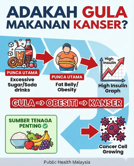 Kaitan gula dengan kanser adalah TIDAK LANGSUNG. Bila anda makan gula berlebihan -> Berat badan naik (Obesiti) -> Berlaku "Rintangan Insulin" (Insulin Resistance).