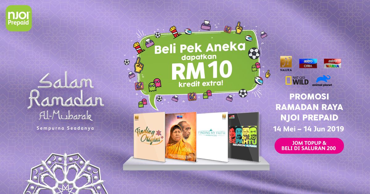 Jadi tunggu apa lagi, tak NJOI la beraya kalau tak dapatkan Pek Aneka ini. Jom tambah nilai sekarang dan nikmati pelbagai promosi serta program menarik hanya di NJOI Prepaid bulan Ramadan dan Syawal ini. Untuk pembeli sila ke saluran 200 dan untuk tambah nilai secara Online boleh terus ke Pautan ini NJOI Prepaid.