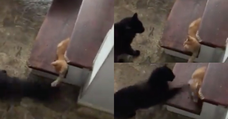 Menerusi video itu, Oyen yang kecil itu dilihat menunggu kehadiran kucing hitam dan seperti mencari masa yang sesuai untuk menyentuh ekor kucing yang lebih besar daripadanya itu.