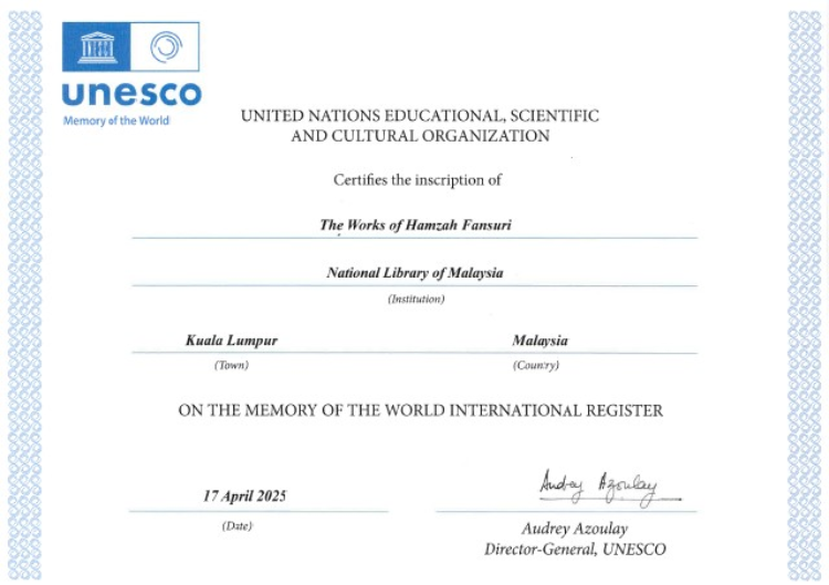 Pengiktirafan UNESCO terhadap manuskrip Melayu karya-karya Hamzah Fansuri bukan sahaja mengangkat martabat karya-karya agung Melayu, tetapi juga membuktikan kemampuan PNM sebagai penjaga warisan dokumentari intelektual negara.