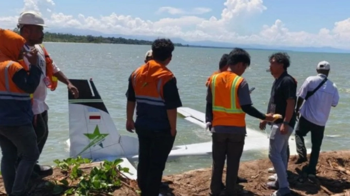 Menerusi gambar yang dikongsikan, badan pesawat berkenaan kelihatan berada separuh tenggelam dalam air, manakala pasukan penyelamat berada di lokasi kejadian.