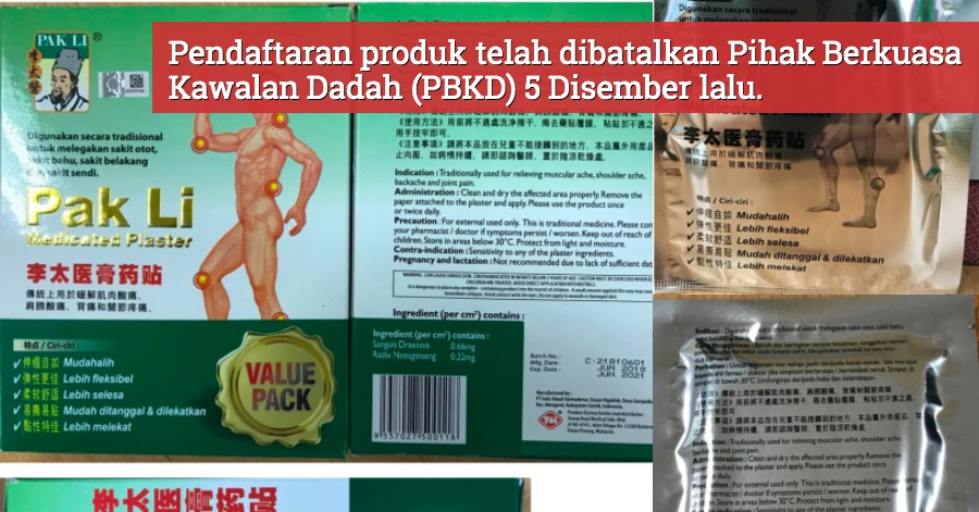 Kuala Lumpur – Pihak Berkuasa Kawalan Dadah (PBKD) telah membatalkan pendaftaran produk plaster tradisional jenama Pak Li Medicated Plaster yang mengandungi racun terlarang.